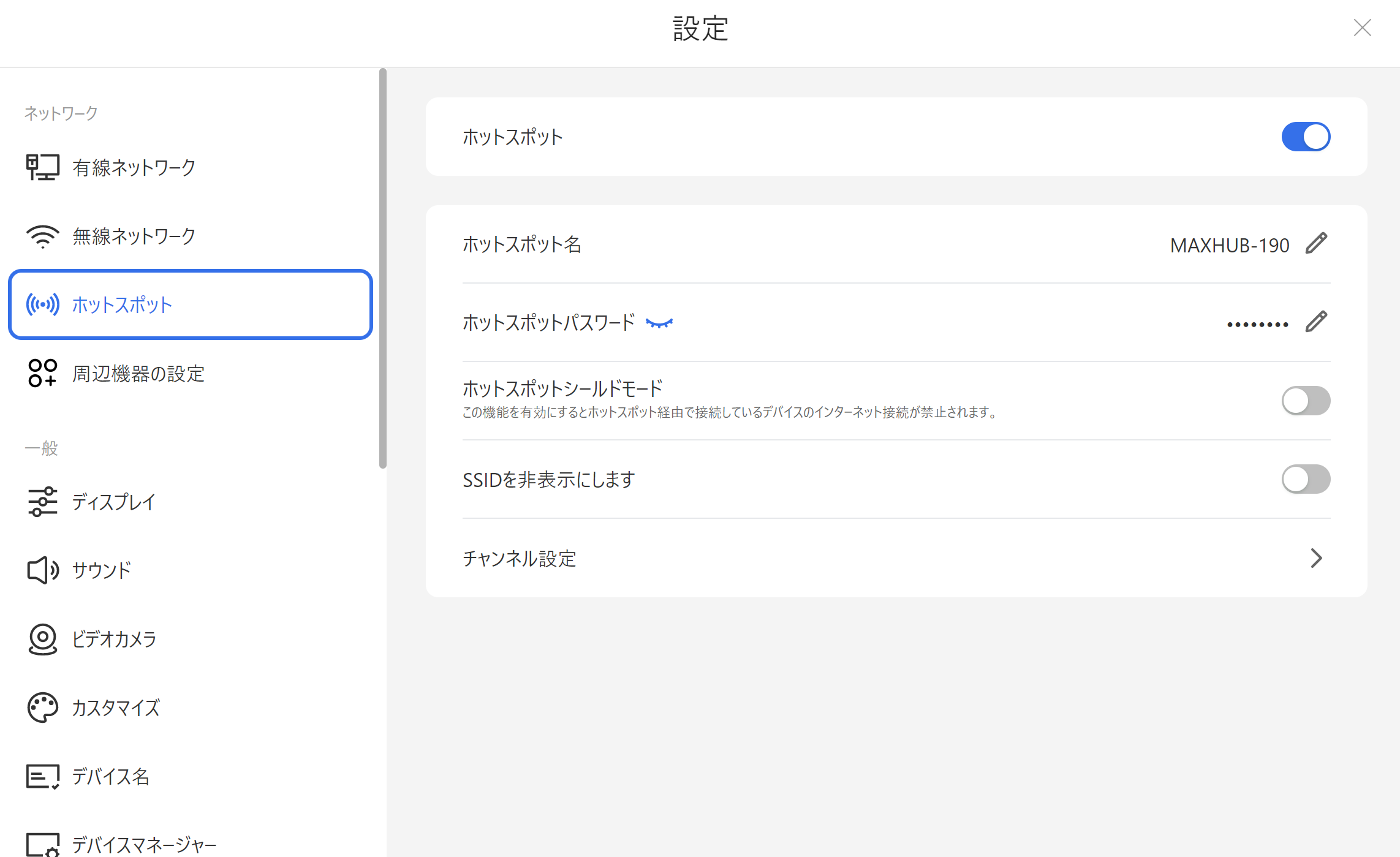 ホットスポットのチャネルと帯域幅の設定が可能です。