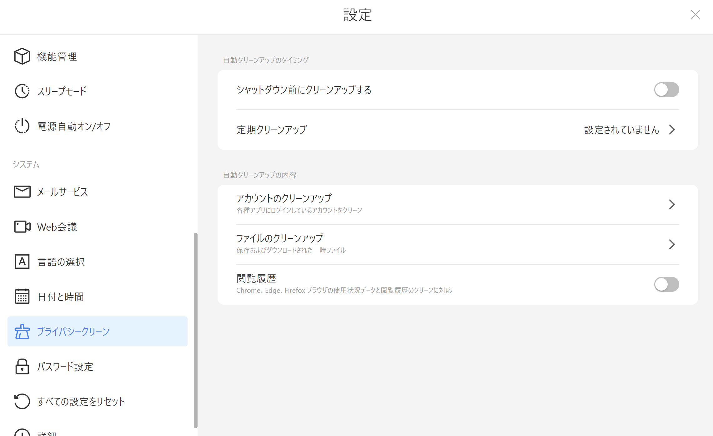ON にすると、シャットダウン時に「自動クリーンアップの内容」に合わせてクリーンアップを実行します。