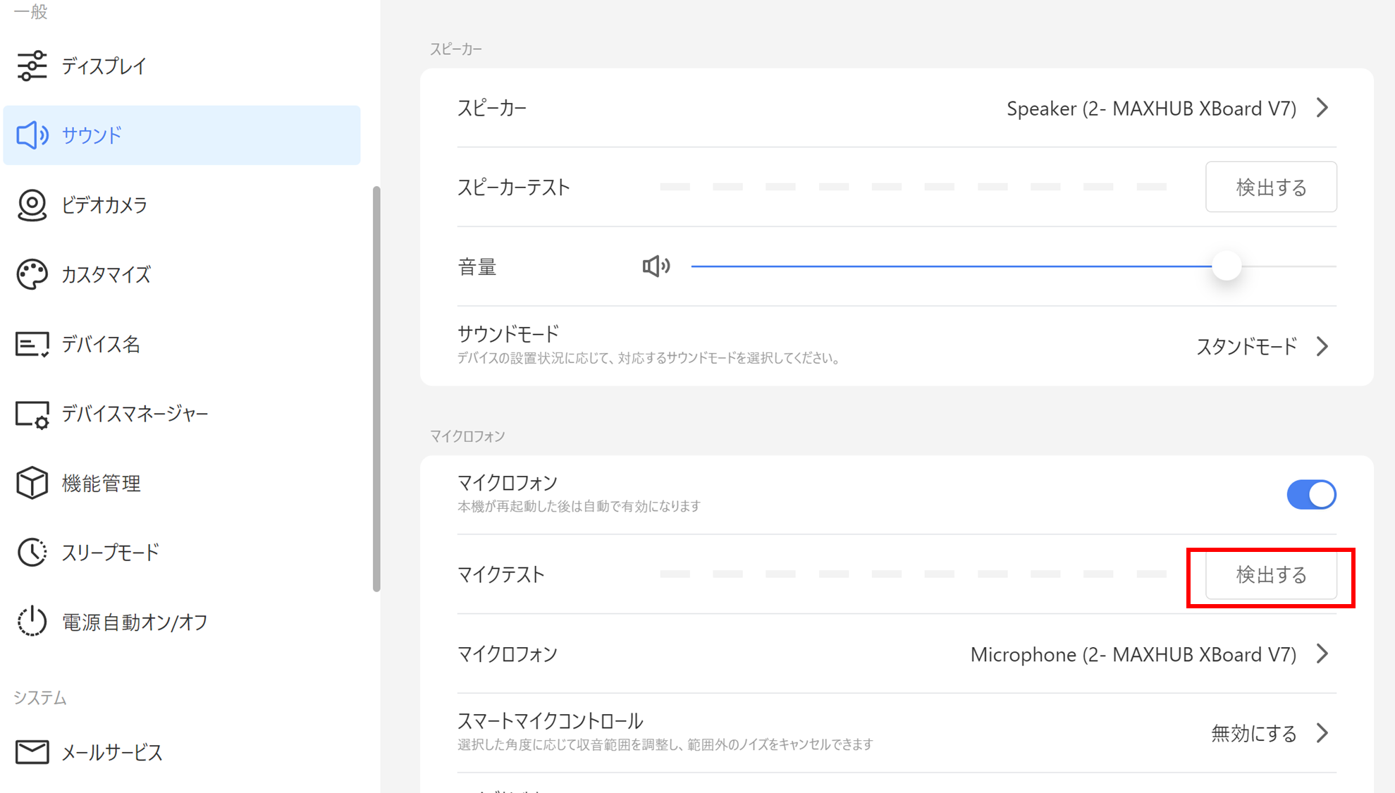サウンド>マイクのテストを実施し、この時点で自身の声が正常に聞き取れることを確認します。