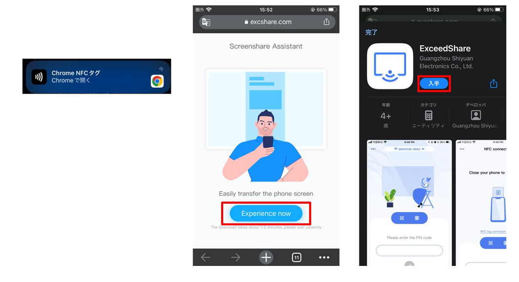 3) NFCが反応し通知が表示されたらタップしてExceed Shareをインストールします。(初回のみ)