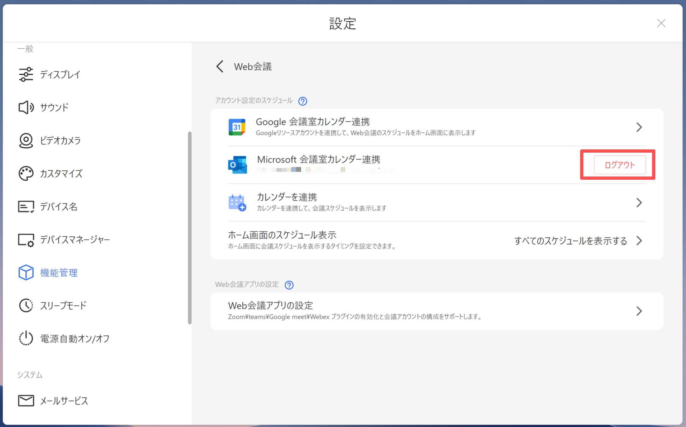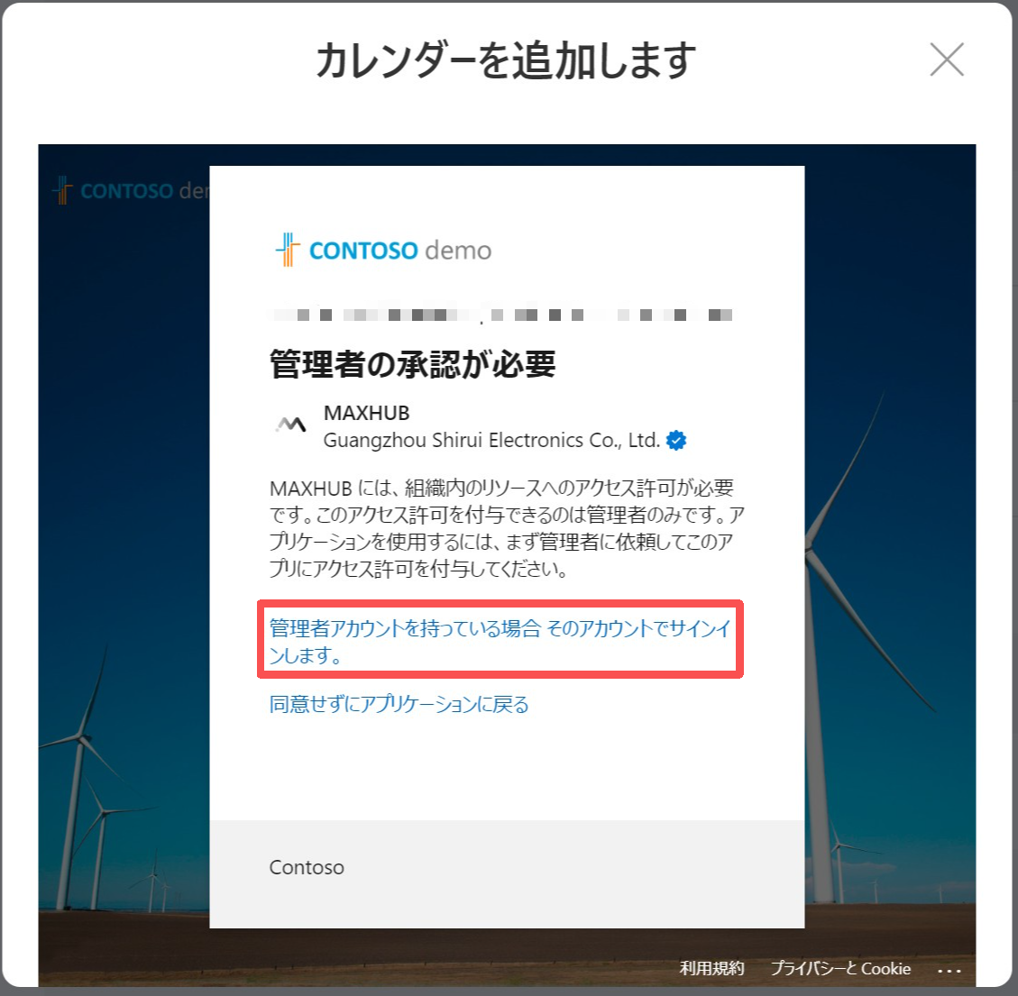承諾後、管理者のアカウントでサインインされます。「ログアウト」を選択してログアウト後、リソースアカウントでサインインし直してください。