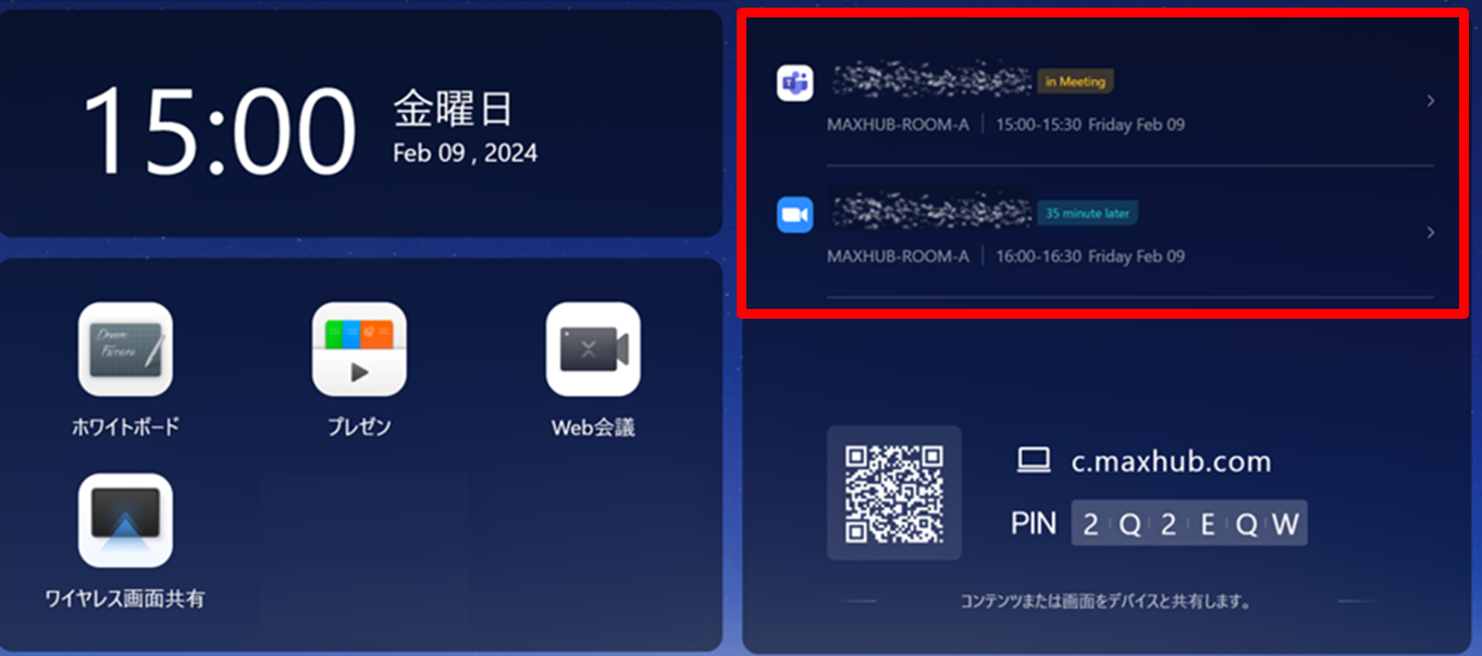 Microsoft 365やGoogleの会議室リソースアカウントを本機に連携すると、本機のホーム画面に会議室リソースアカウントの予定表を表示できます。