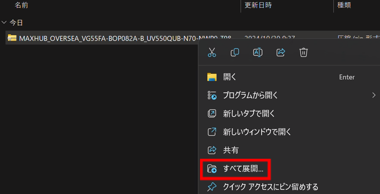 ダウンロードしたZipファイルを右クリックし「すべて展開」し、フォルダ「upgrade_982」を任意のUSBメモリのルートディレクトリ(一番上の階層)に保存します。