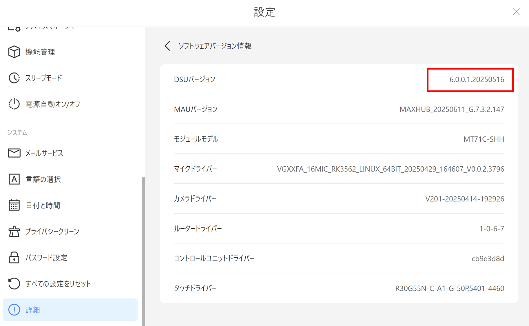 ソフトウェアバージョン情報のDSUバージョン
