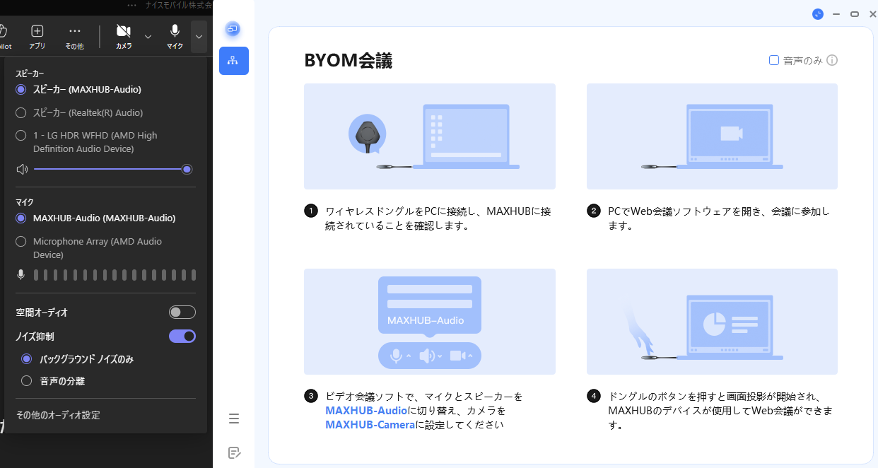 ワイヤレスドングルを使用して、PCからミーティングボードのカメラ・マイク・スピーカーを使用する機能(以下BYOM機能という)のデバイス名が変更されました。