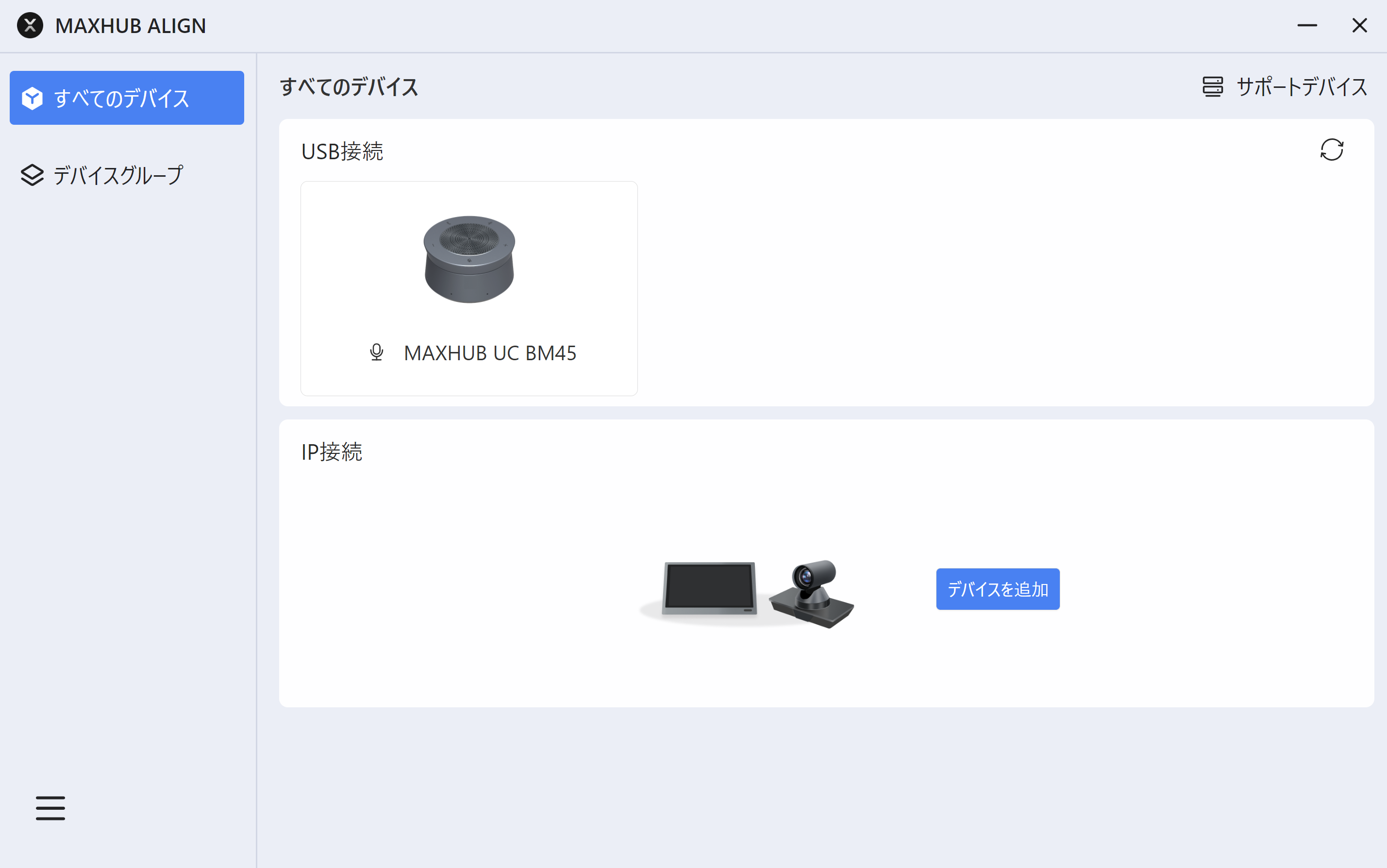 本機に接続されているMAXHUBデバイス(カメラ・オーディオ機器など)の管理ができます。