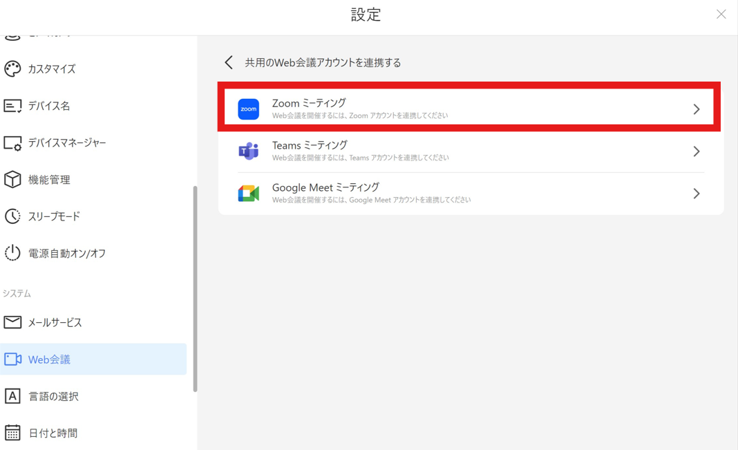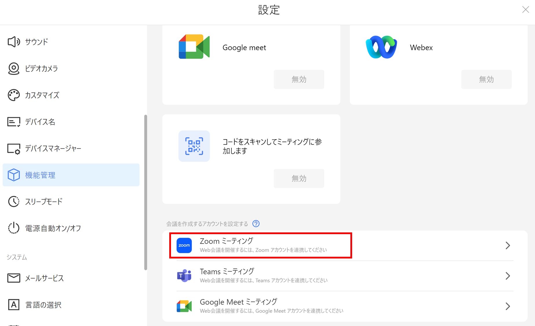 設定>機能管理>Web会議>Web会議アプリの設定>Zoomミーティング