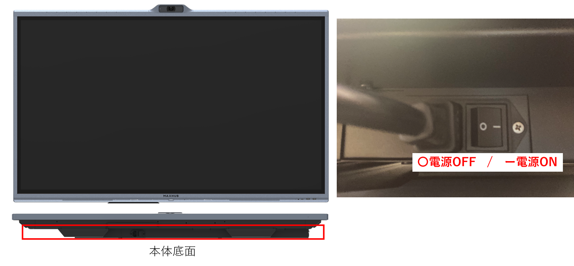 本体の主電源スイッチを一度オフに切り替え、再度オンに切り替えることにより、電源LEDが赤く点灯し電源起動が可能となります。