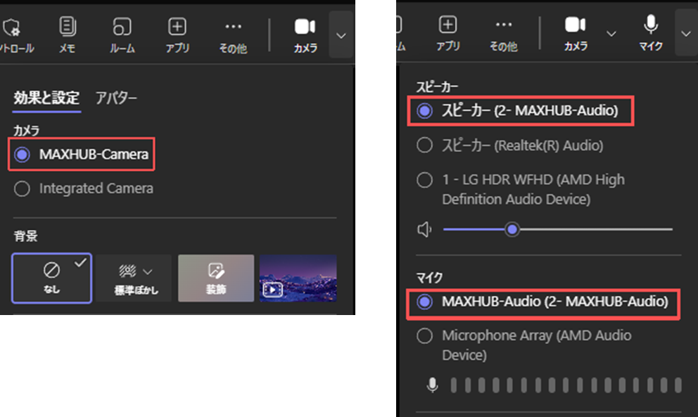 3)マイク・スピーカーは「MAXHUB-Audio」を選択し、カメラは「MAXHUB-Camera」を選択します。