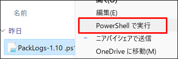 PackLogs-1.11 .ps1 を右クリックし、「PowerShellで実行」クリックします