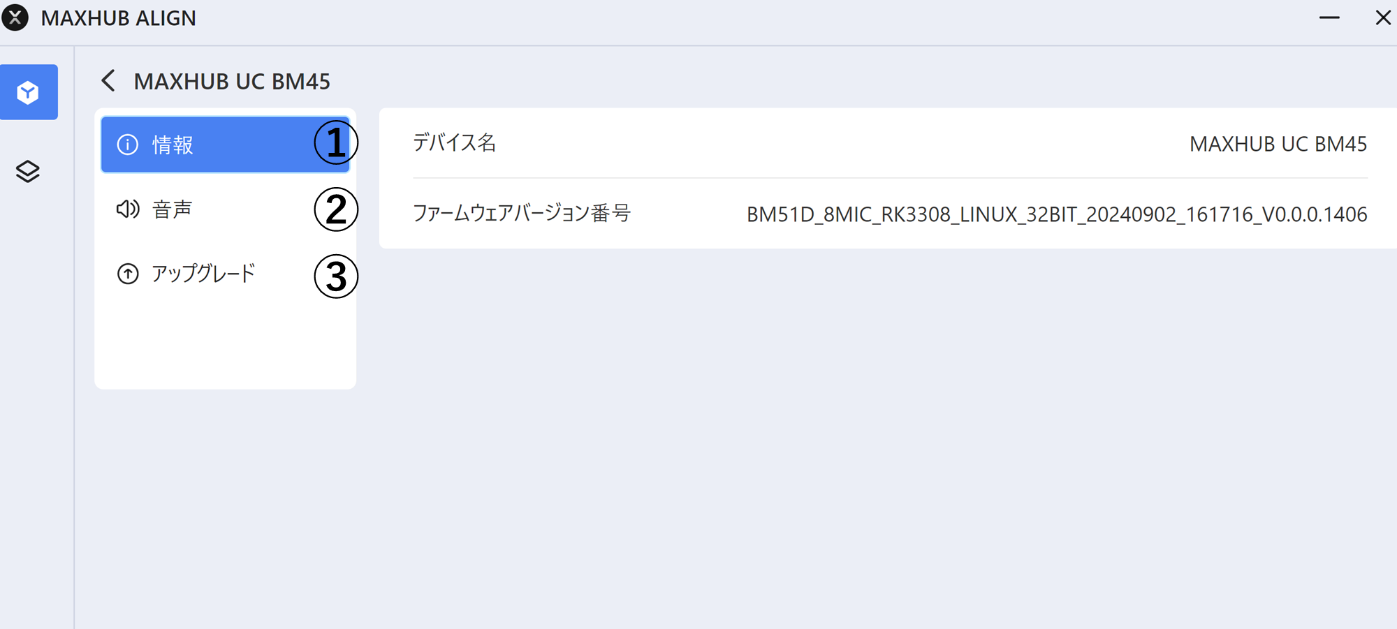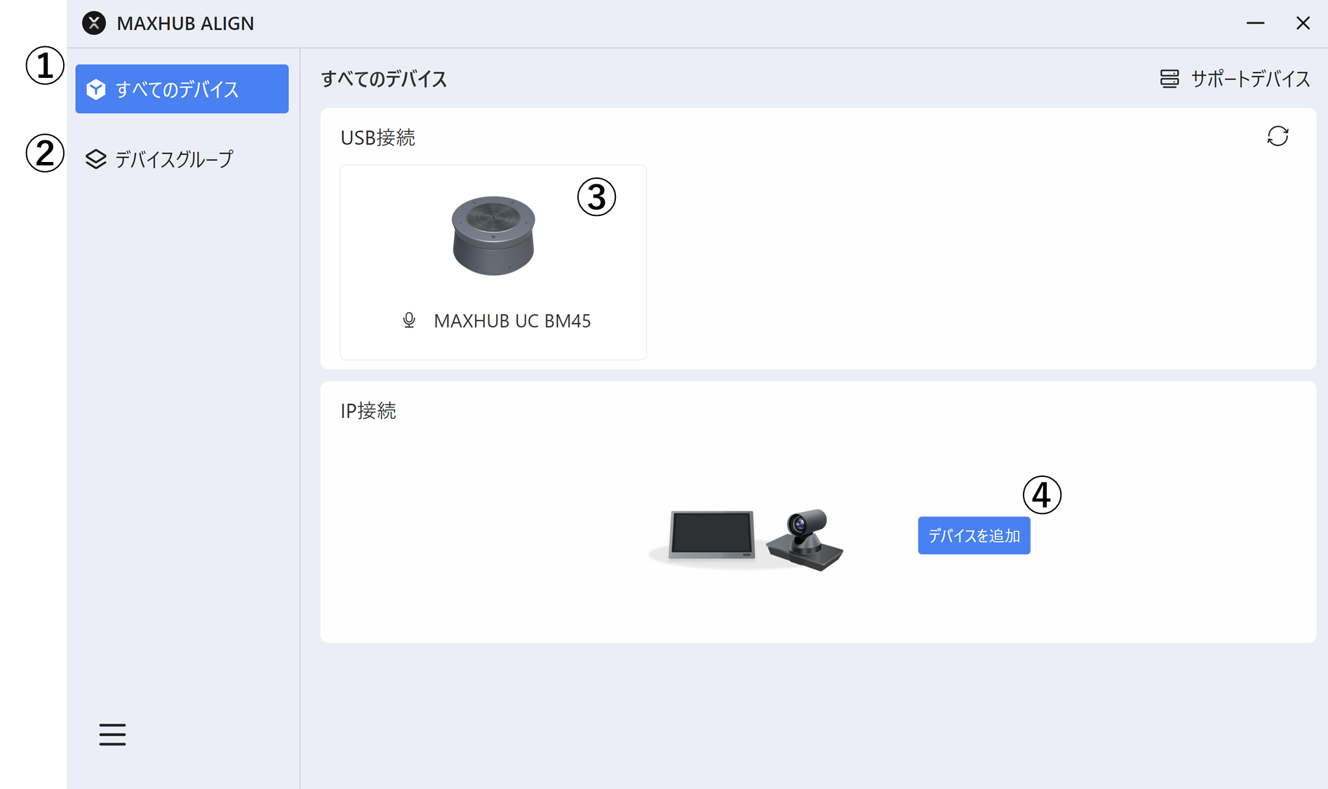 本機に接続されているMAXHUBデバイス(カメラ・オーディオ機器など)の管理ができます。
