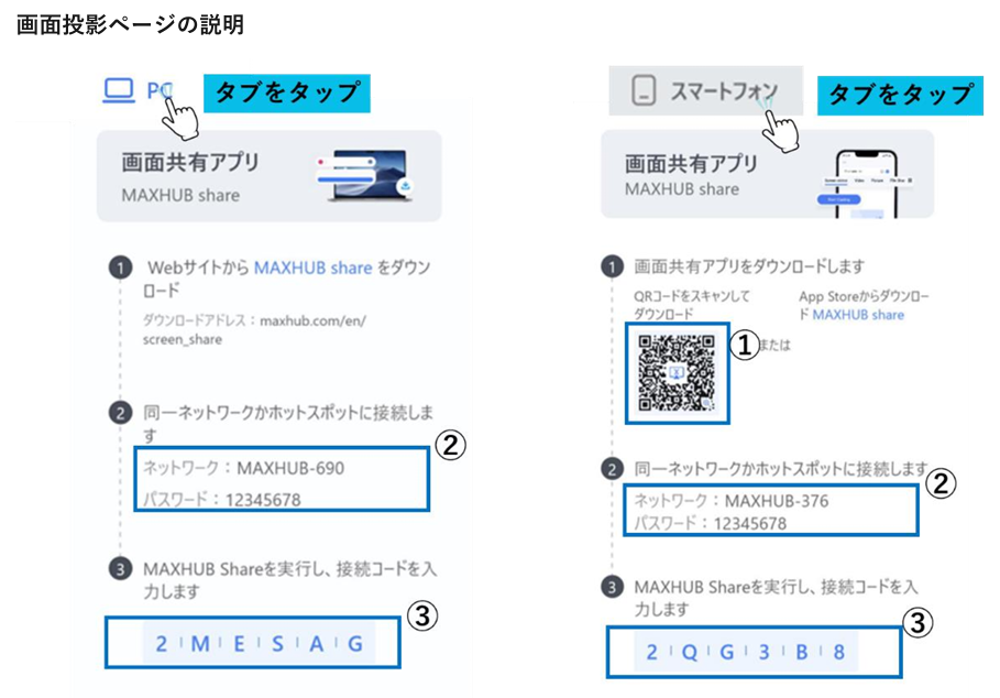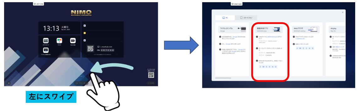 ホーム画面を左にスワイプすると画面投影ページが表示されます。画面投影ページ>画面共有アプリの項目にMAXHUB Shareの投影方法が記載されています。