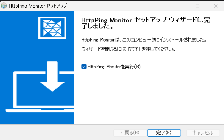 インストールが完了したら、 [HttpPing Monitorを実行] にチェックが入っていることを確認し、[完了]を選択します。