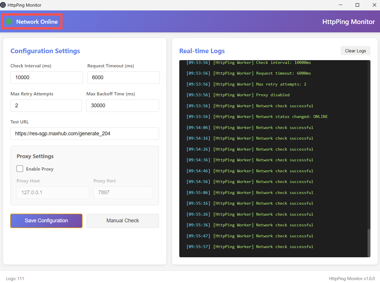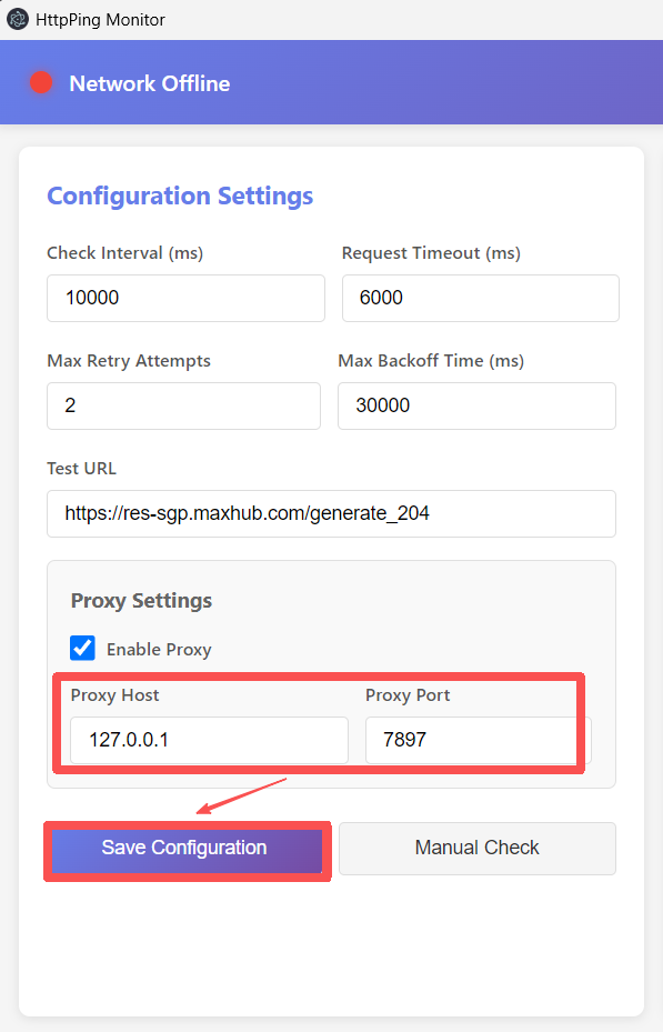 プロキシサーバーのアドレスとポートを入力して、[Save Configuration] を選択してください。