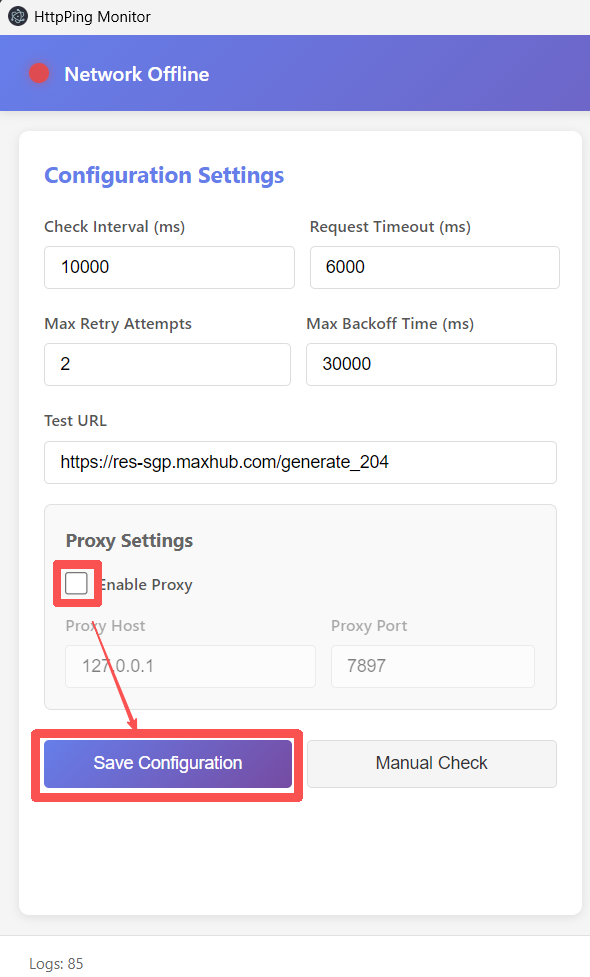 [Enable Proxy]のチェックを外し、[Save Configuration] を選択してください。