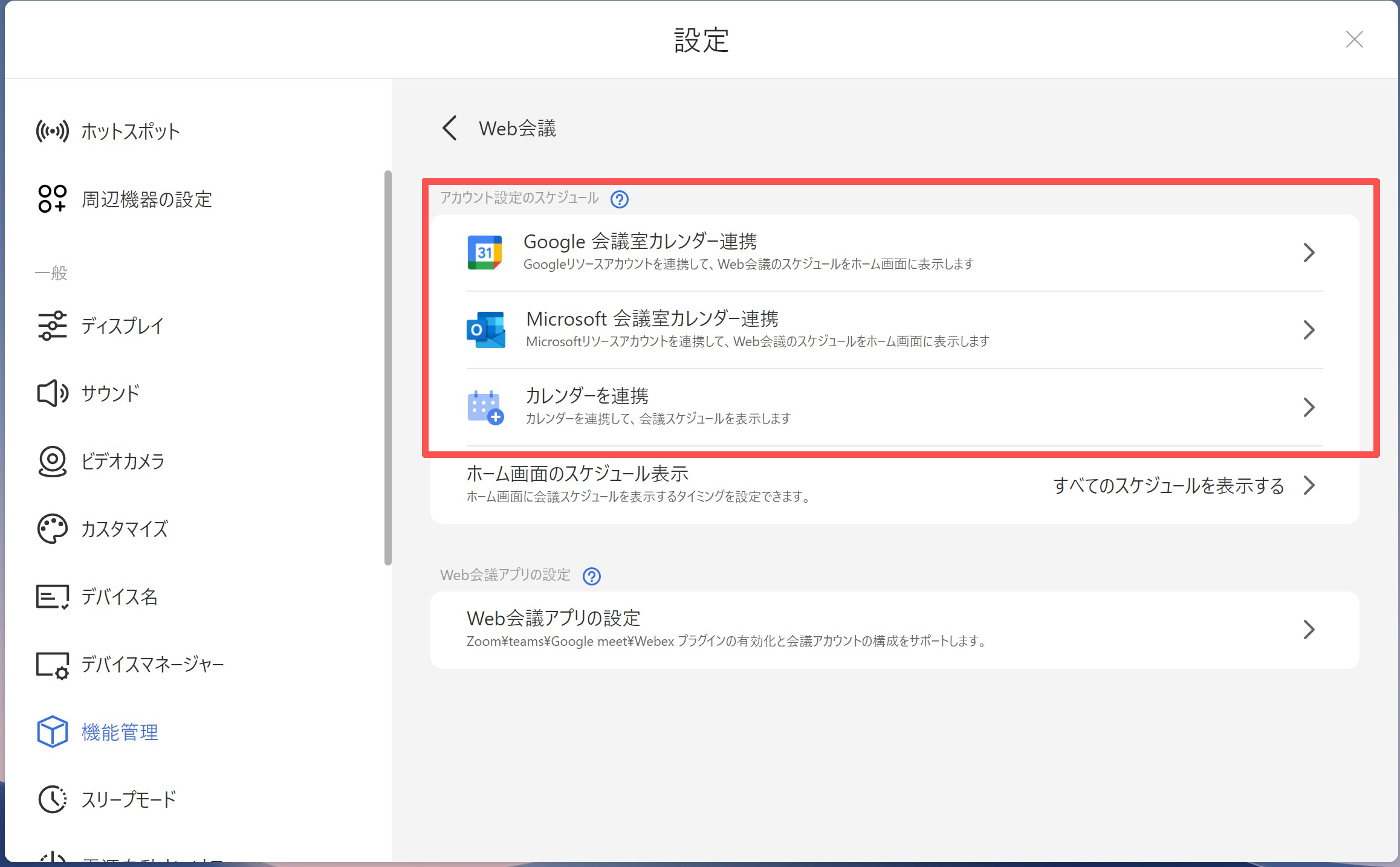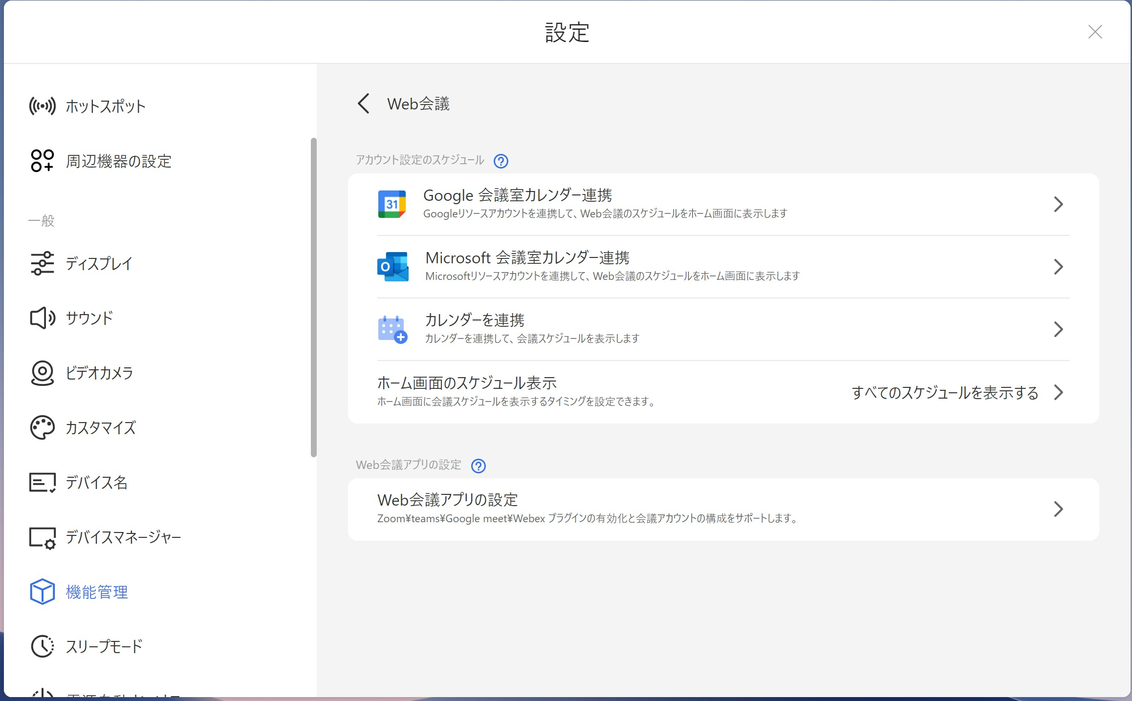 設定 > 一般 - 機能管理 > Web会議