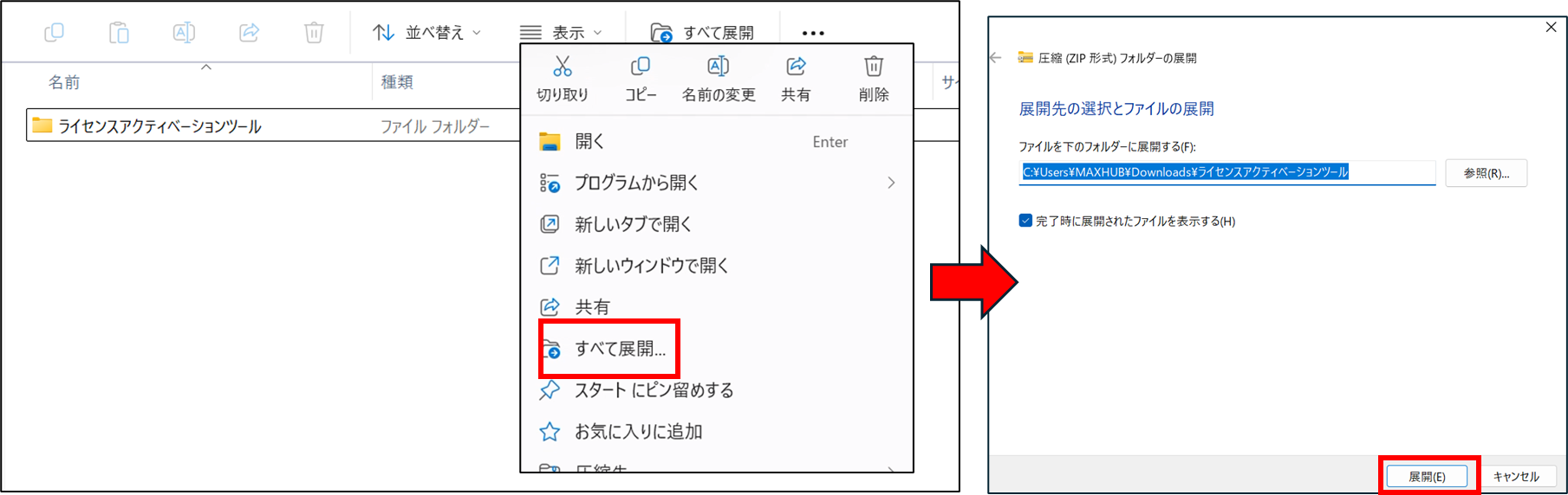 ダウンロードしたファイルを長押し(右クリック)して「すべて展開」を選択し、「展開(E)」をタップします。