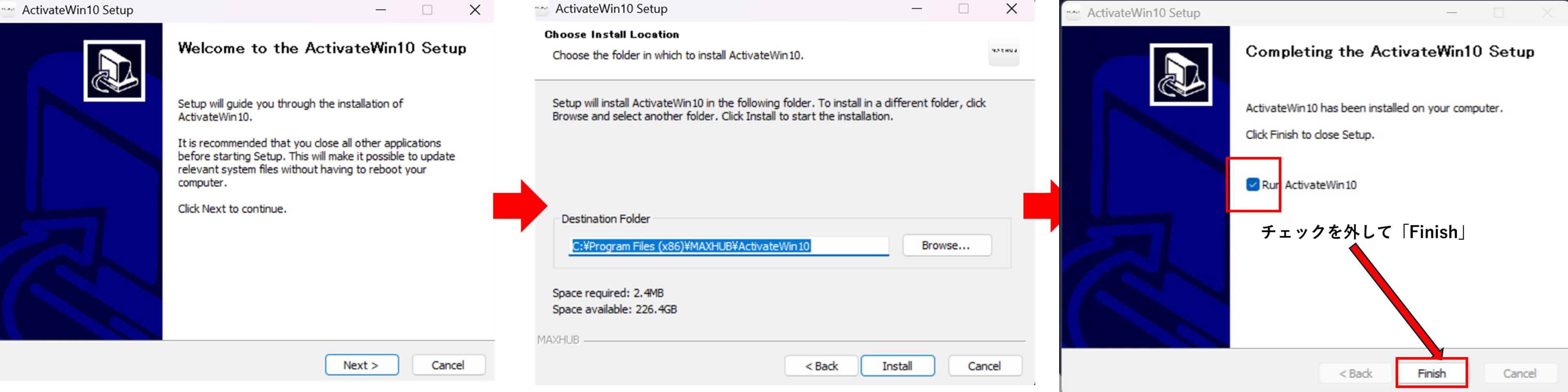 ※万が一チェックを外し忘れた場合、その後に起動されるウィンドウを×で閉じます。