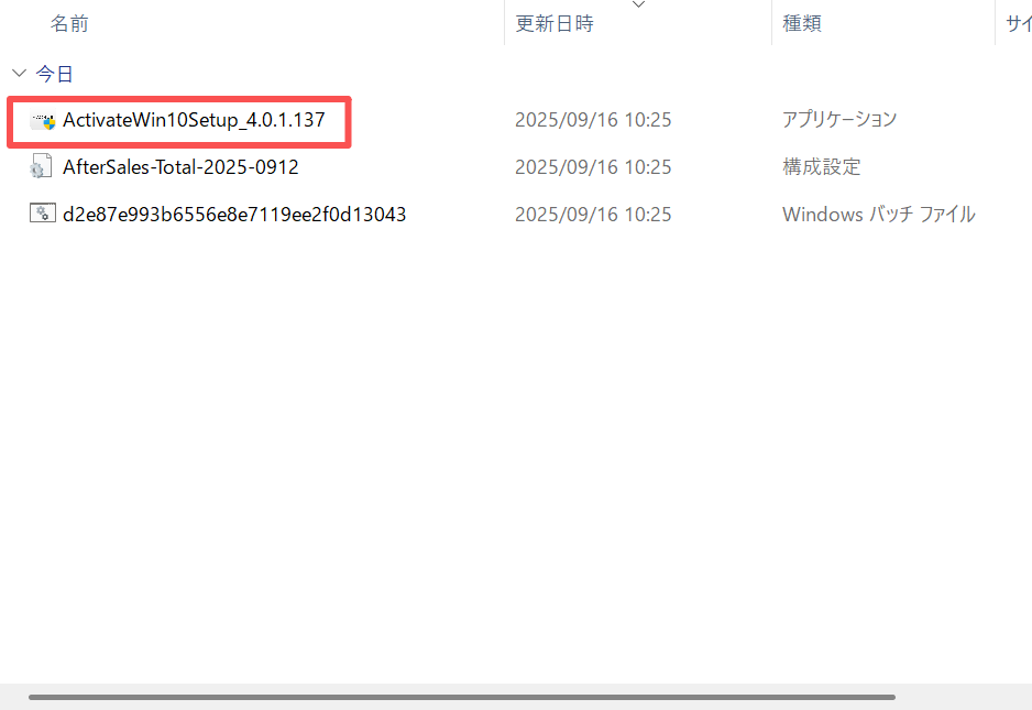 展開後、ライセンスアクティベーションツールフォルダ内の「ActivateWin10Setup_4.0.1.137exe」を長押し(右クリック)して「管理者として実行」します。
