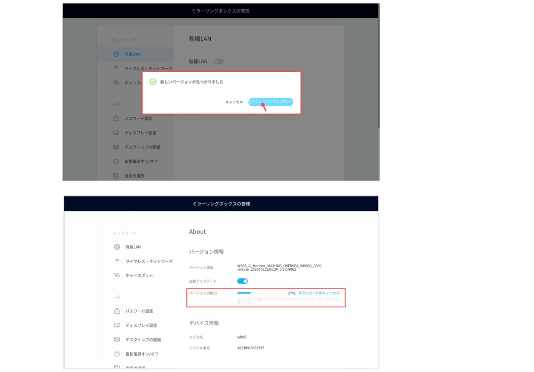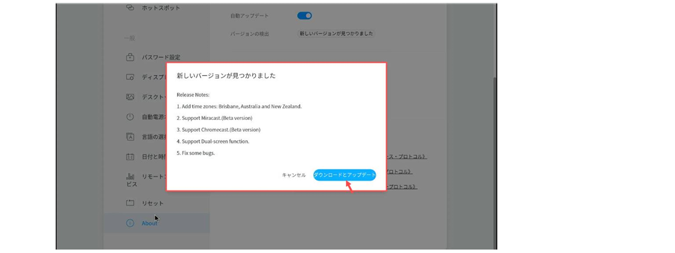 ② 現在のバージョンが最新でない場合、設定画面を開くと