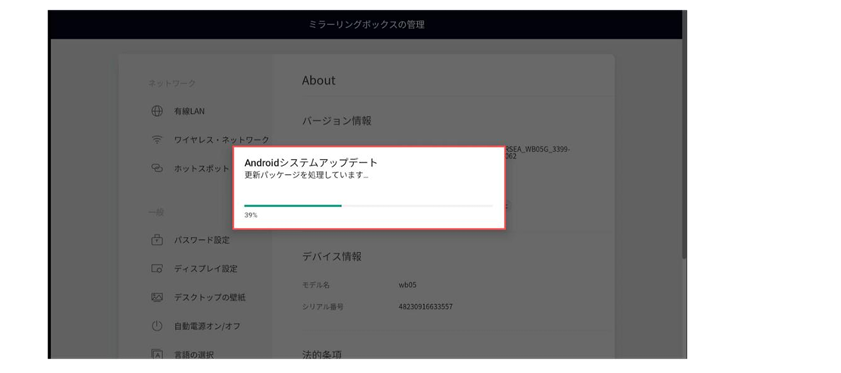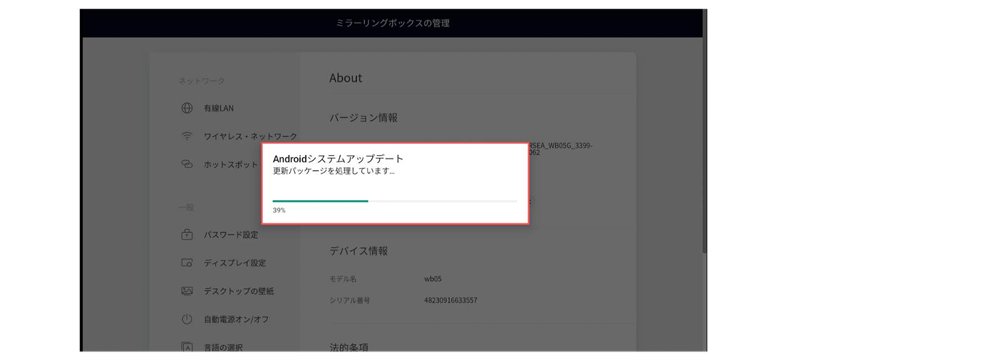 ④ ダウンロードが完了後、自動的にアップデートが始まります。アップデートが完了すると自動で本機が再起動します。