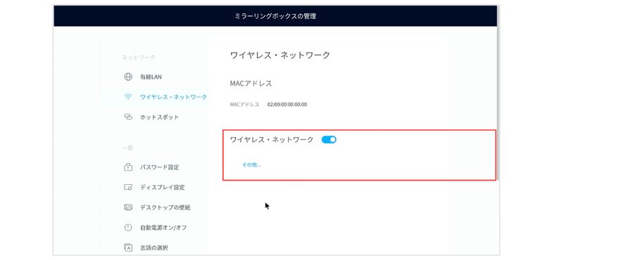 ① 設定画面を開き(設定画面の開き方)、ネットワークの設定を行います。(画像はWi-Fi接続)