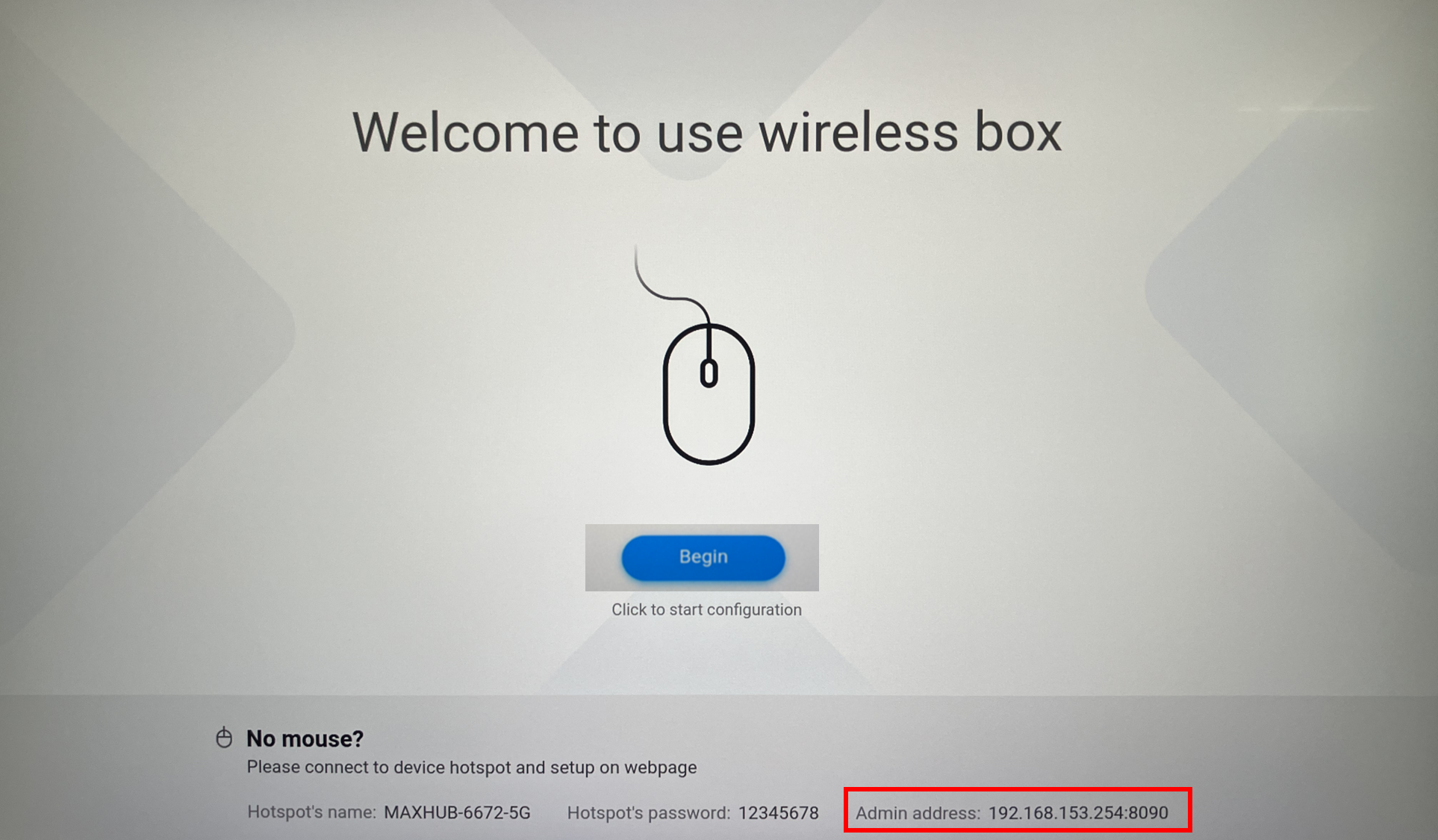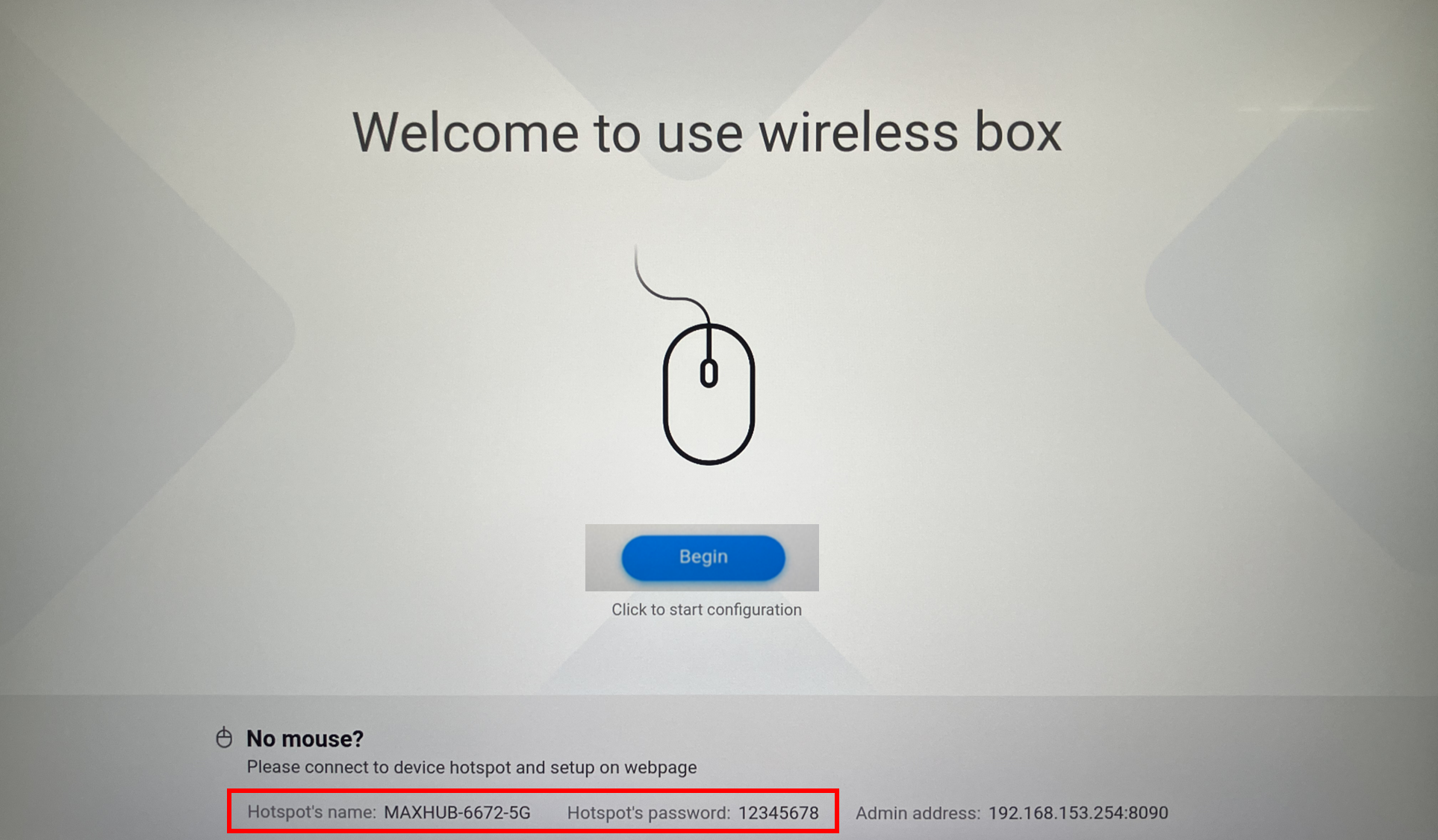 USBマウス(有線・無線どちらでも可)を本機に接続の上、マウス操作で「Begin」をクリックし、初期設定を行います。
