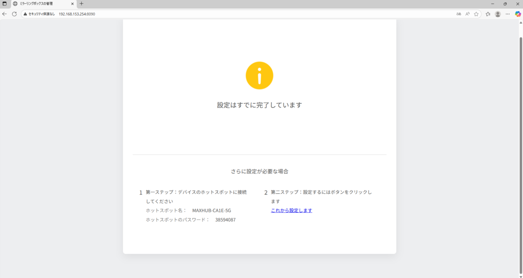 PCをWi-Fiを、初期設定画面の下にある「Hotspot's name」に繋ぎます。