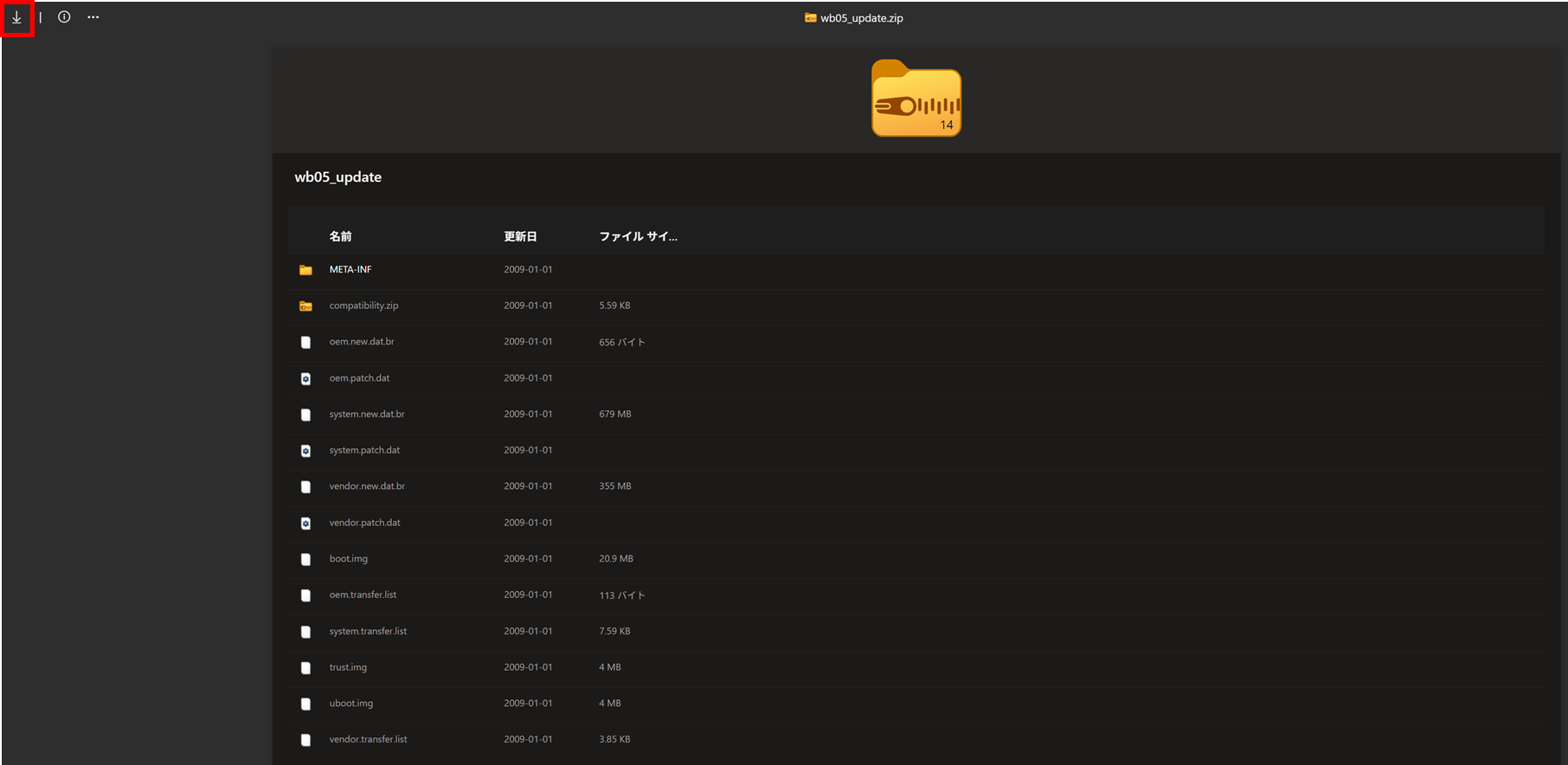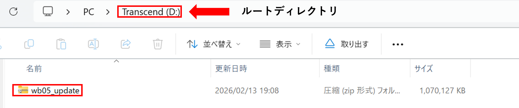 2.ダウンロードしたzipファイルは展開せず、[wb05_update.zip] をFAT32のUSBメモリのルートディレクトリ(一番上の階層)にコピーします。