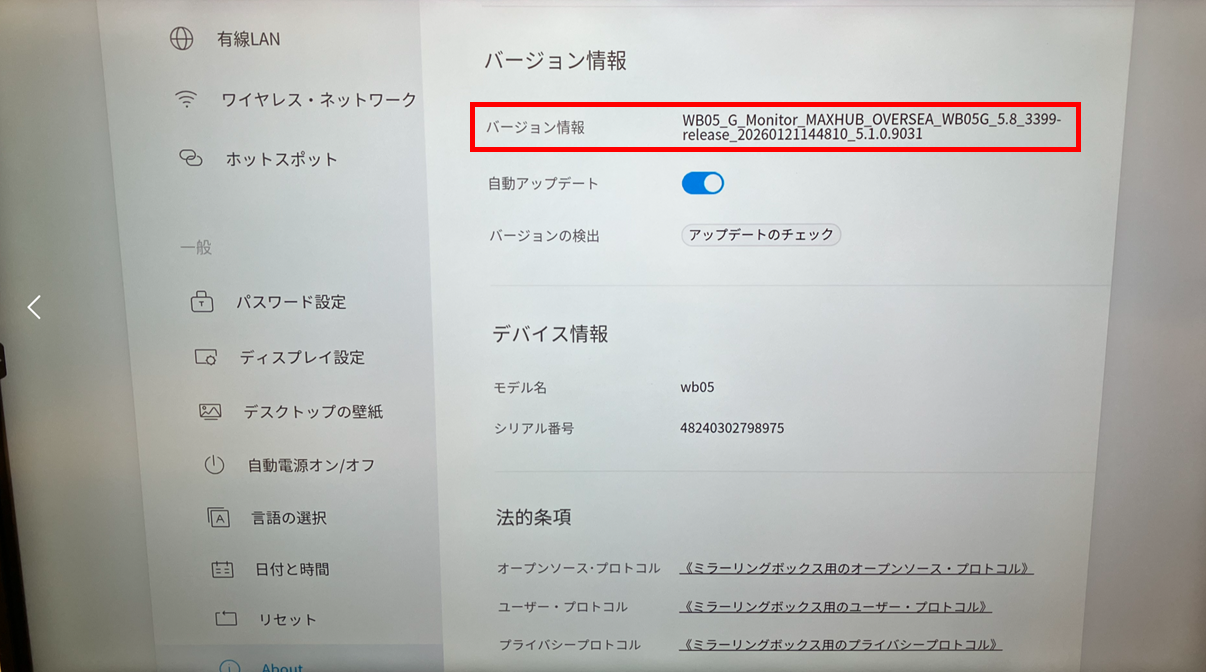 8.本機の設定画面から「About>バージョン情報」が「20260121144810_5.1.0.9031」に更新されていればアップデート完了です。
