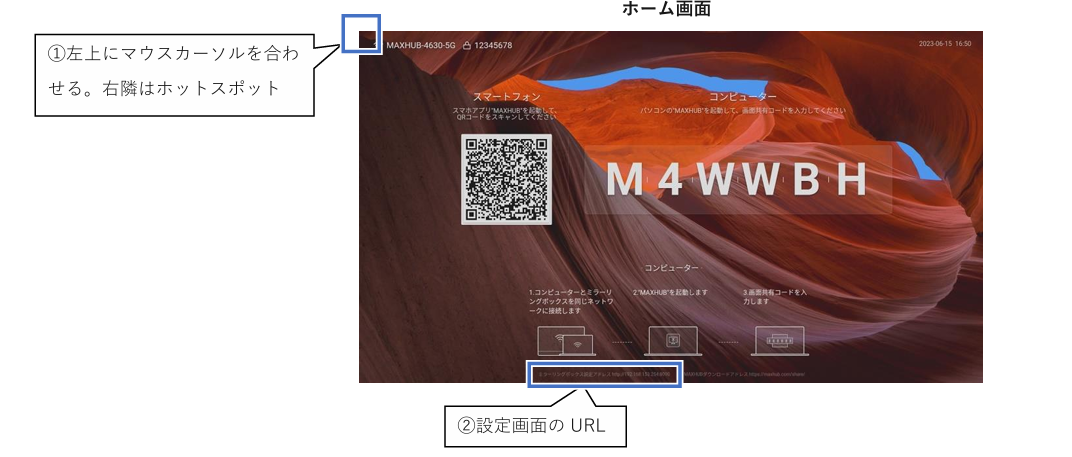 ② PCを本機のホットスポットに接続し、ホーム画面下のURLにPCからアクセス