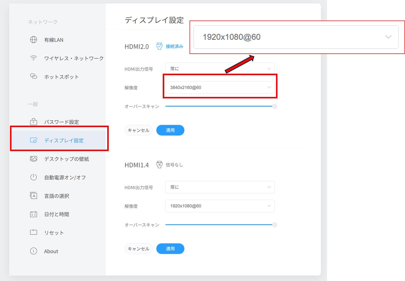 設定画面の「ディスプレイ設定」>「解像度」を1920×1080@60に変更します。