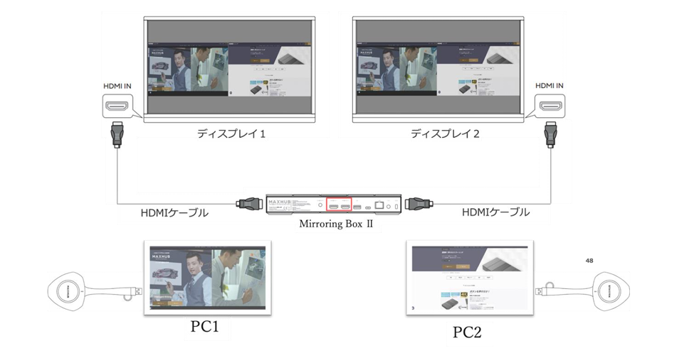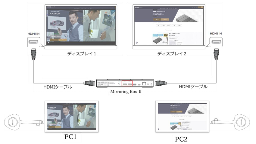 デュアルスクリーンディスプレイ ONにすると、2つのHDMIケーブルから同時に異なる画面を出力できます。(設定変更後、本機を再起動)
