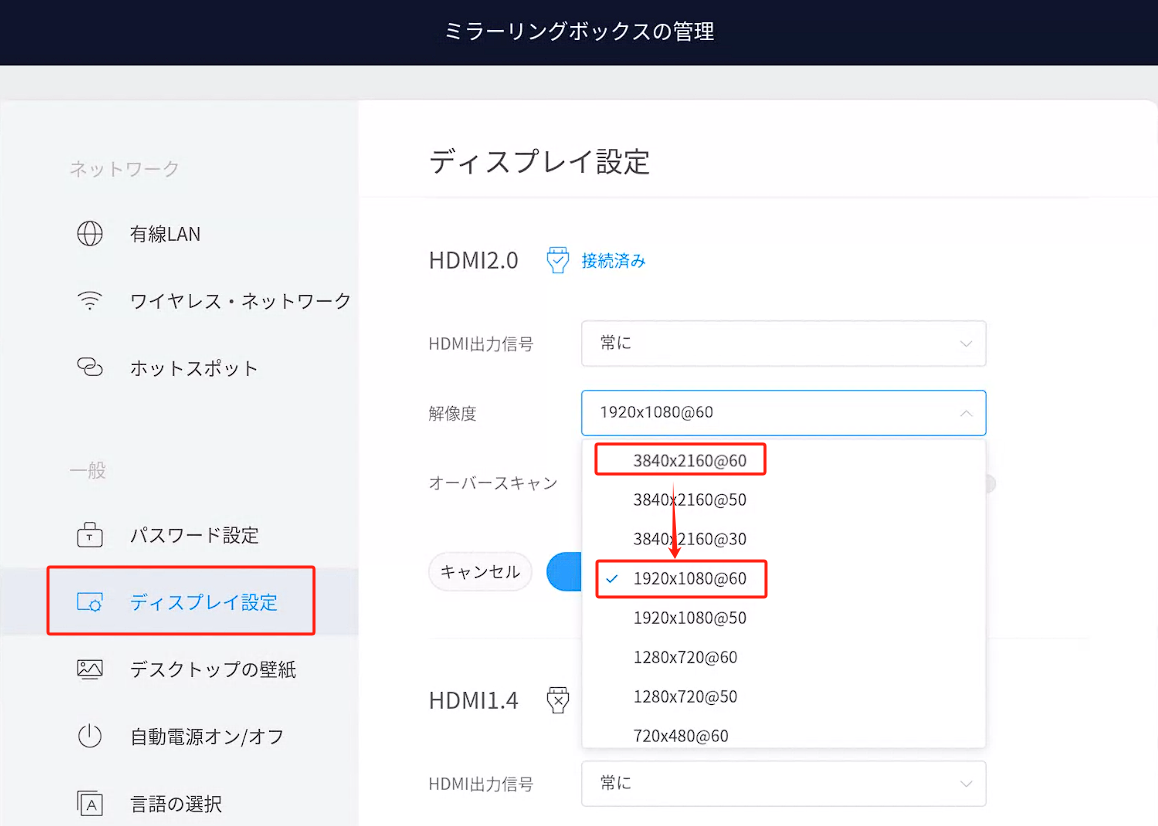 HDMI2.0 とHDMI1.4の出力ポートについて、それぞれ設定ができます。