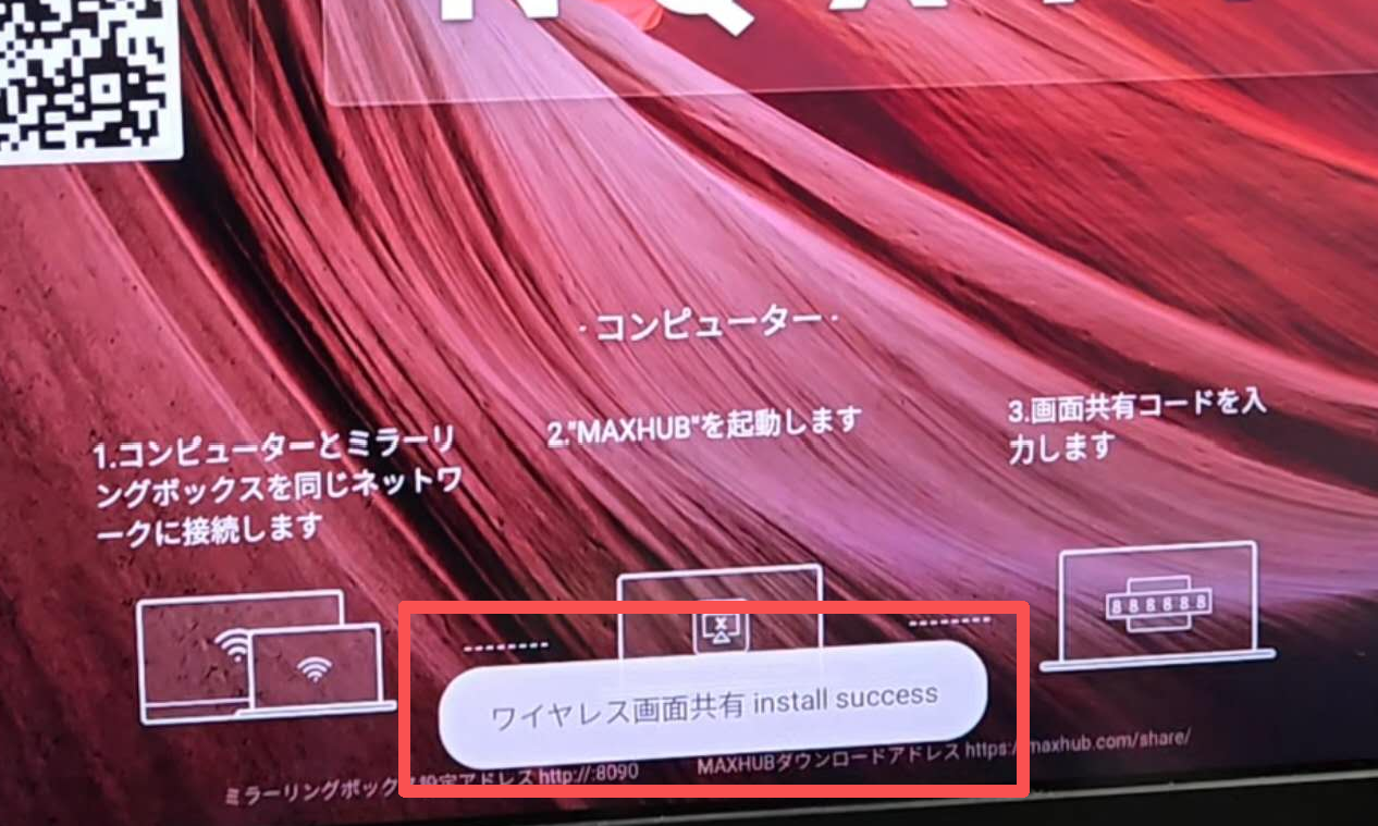 本機にUSBメモリを挿入すると、自動で画面投影ソフトウェアが更新されます。約 30秒後「ワイヤレス画面共有 Install success」の表示がされたら完了です。