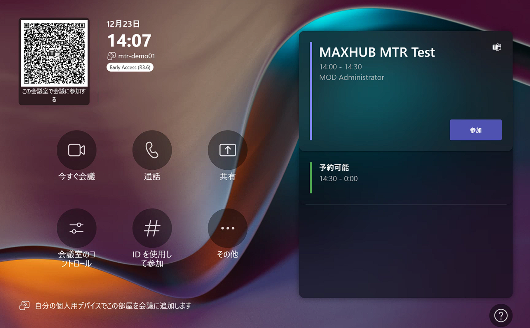 モバイル端末からQRコードをスキャンすると、モバイル端末の予定表にある会議にMicrosoft Teams Rooms端末を参加させたり、モバイル端末の映像をキャストできたりします。詳細は公式ページをご確認ください。