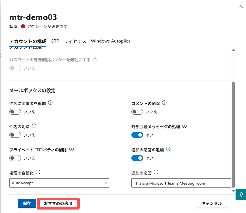 ※[おすすめの適用]を押すとMicrosoft 推奨の設定に変更されます。