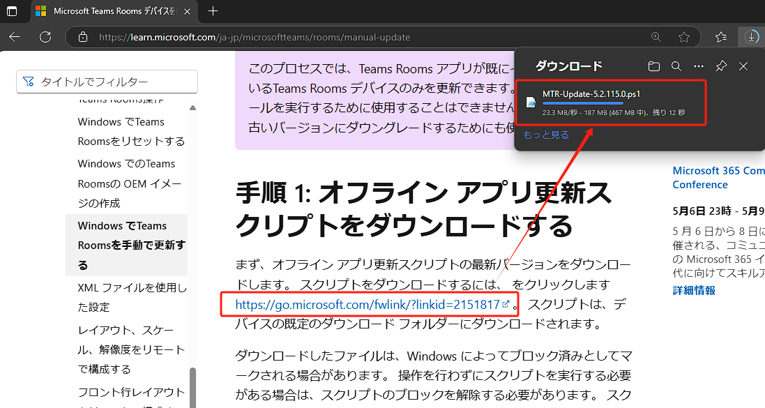Microsoft Edgeを開き、「Teams Rooms 手動更新」と検索し、Windows でTeams Roomsを手動で更新するにアクセスします。
