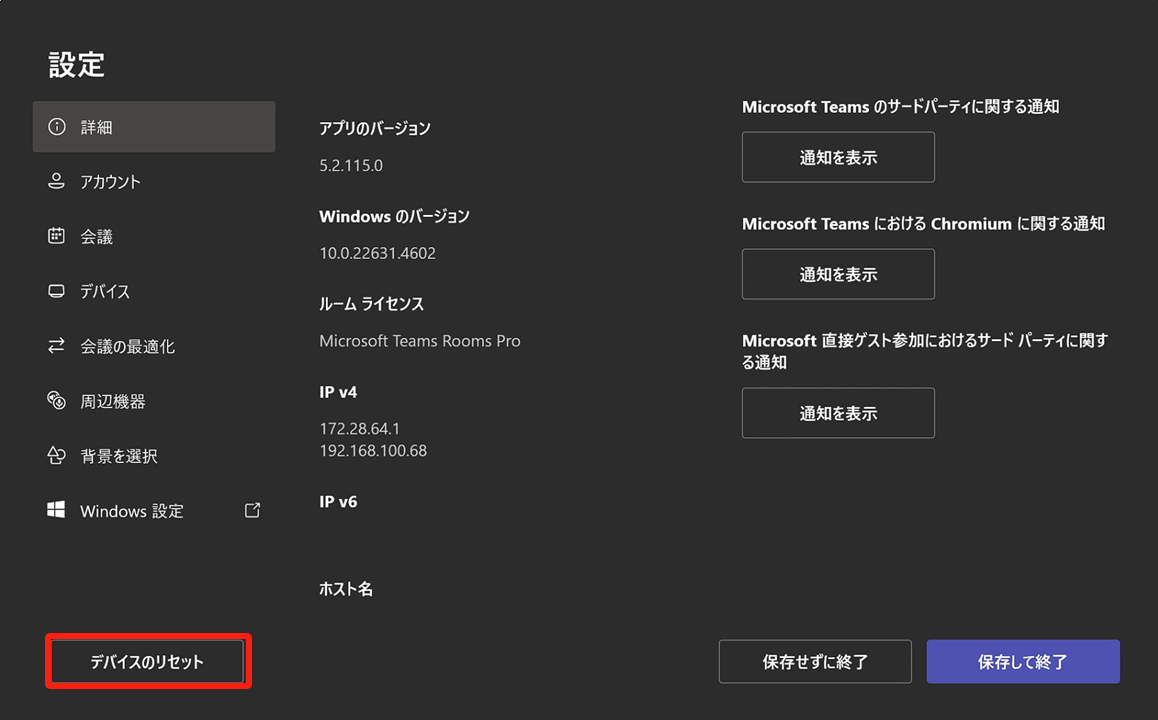 デバイスの資格情報をクリアし、Teams Rooms アプリケーションを既定の設定に戻します。