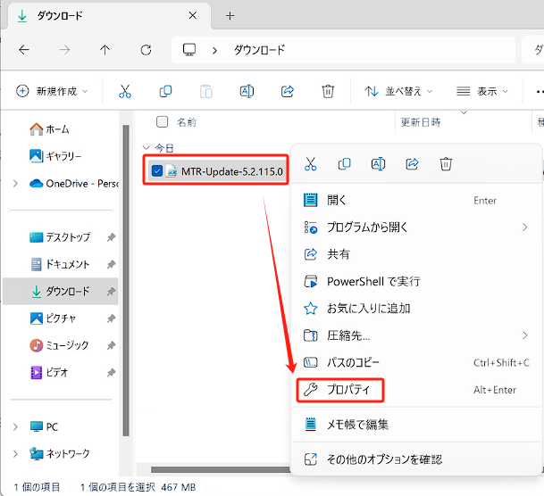 ダウンロードしたスクリプトファイルを長押し(右クリック)し、プロパティを開きます。