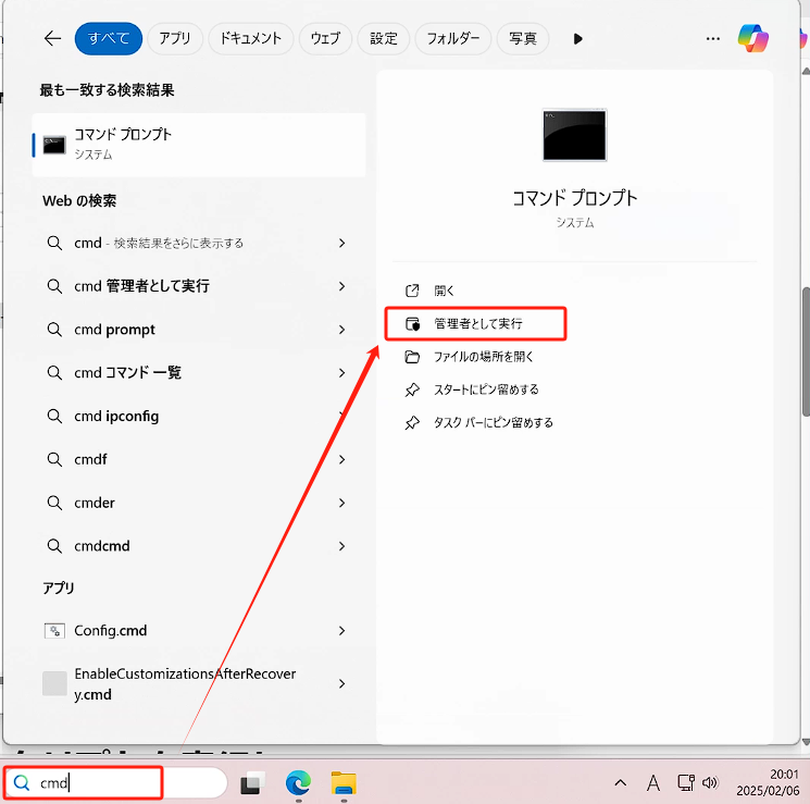 検索バーに「cmd」と入力し、管理者としてコマンドプロンプトを実行します。