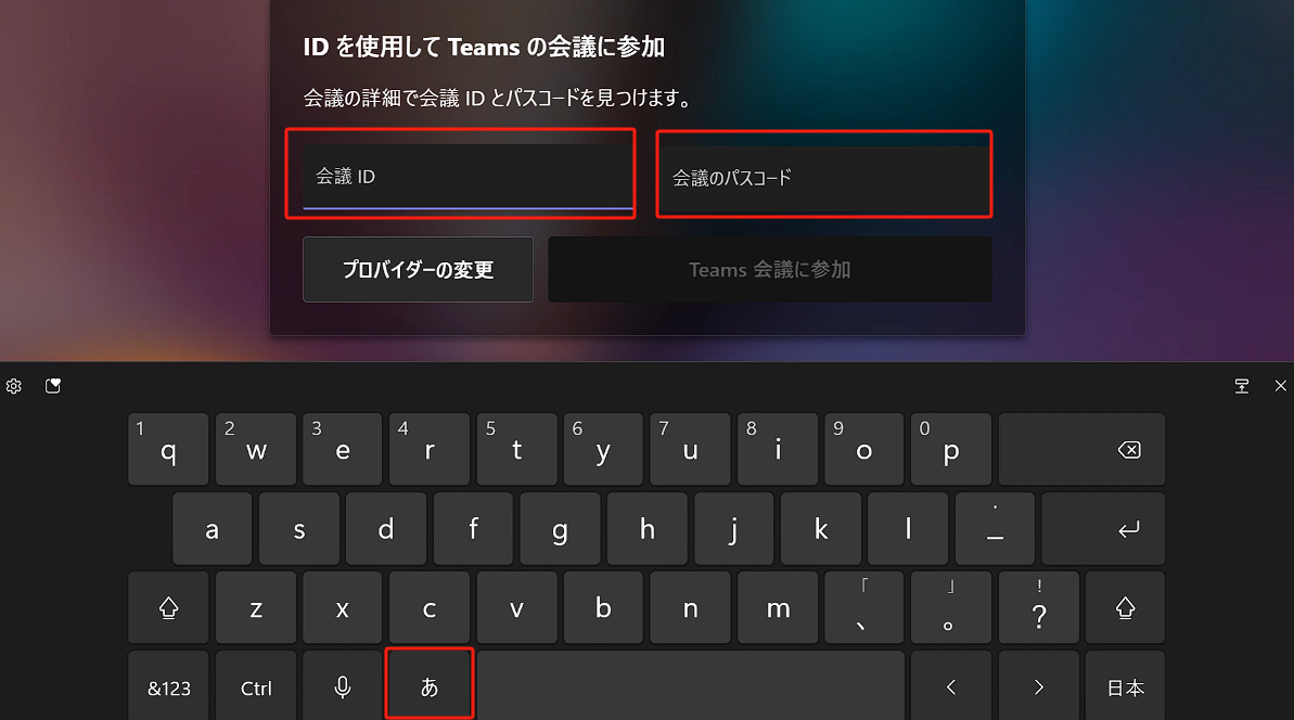 キーボードが日本語IMEの場合、会議IDを入力する前に半角入力に切り替える必要があります。スペースキー左の[あ]を選択して[A]の表示になると半角入力ができます。頻繁にこの機能を使用する場合は、既定のキーボードを英語に変更することを検討してください。