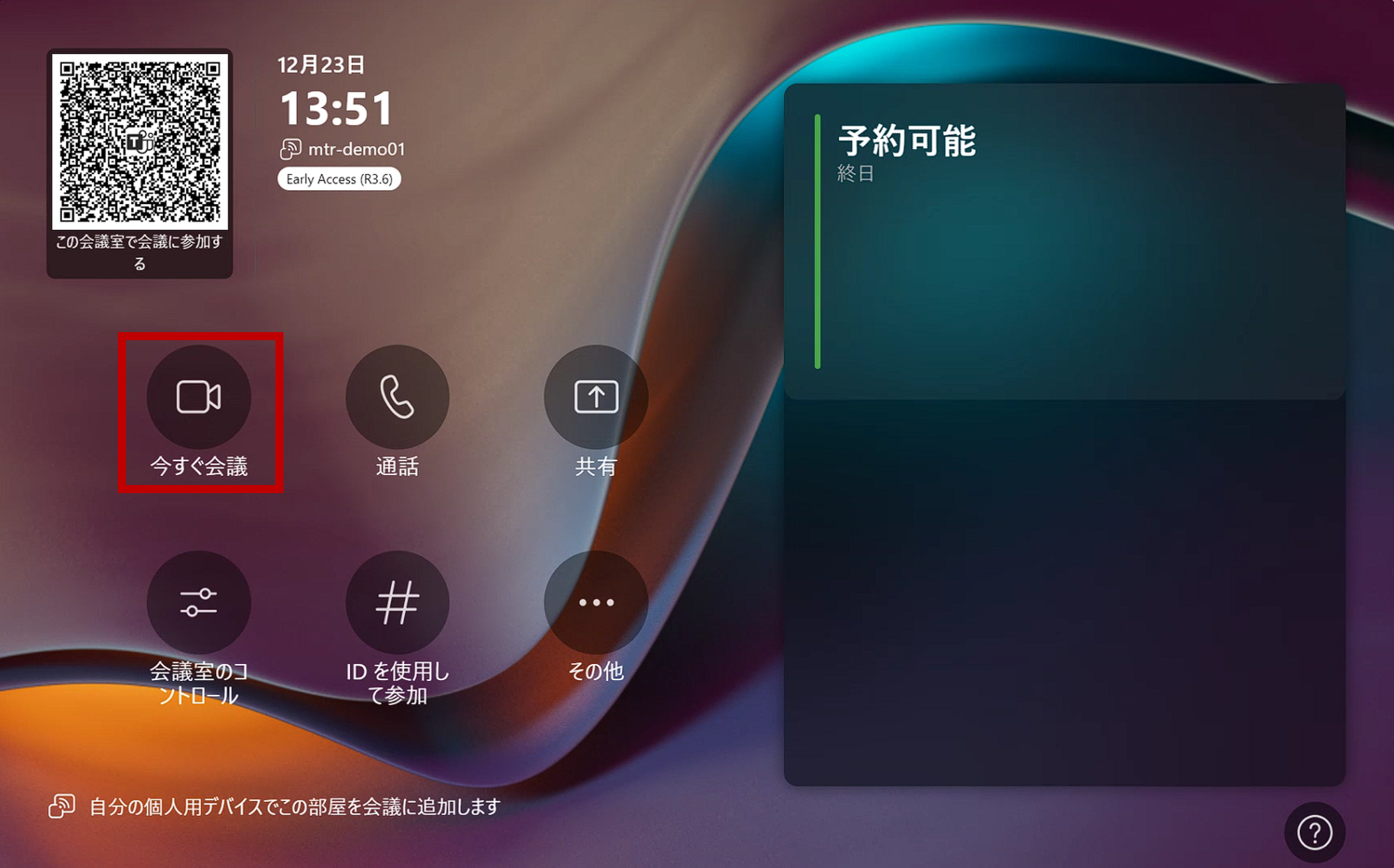 タッチコントロールパネルで「今すぐ会議」を選択します。会議が自動的に開始されます。