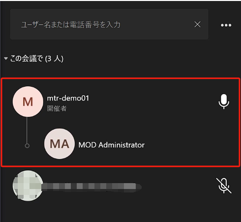 個人用デバイスと付近のTeams Rooms デバイスが同じ会議に参加しているとき、参加者パネル上では会議室にグループ化されて表示されます。