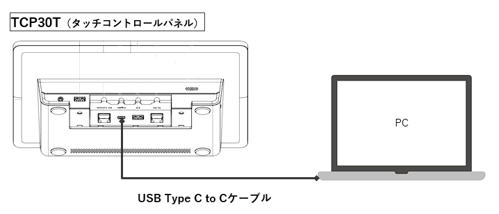 TCP30TのType-C IN と PCのType-C OUT をUSB Type-C to Cケーブル(同梱品)で接続します。