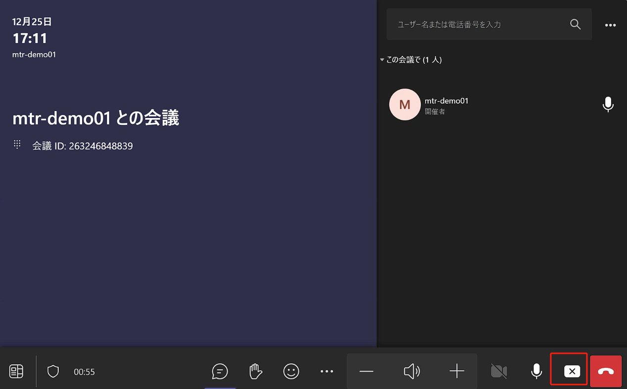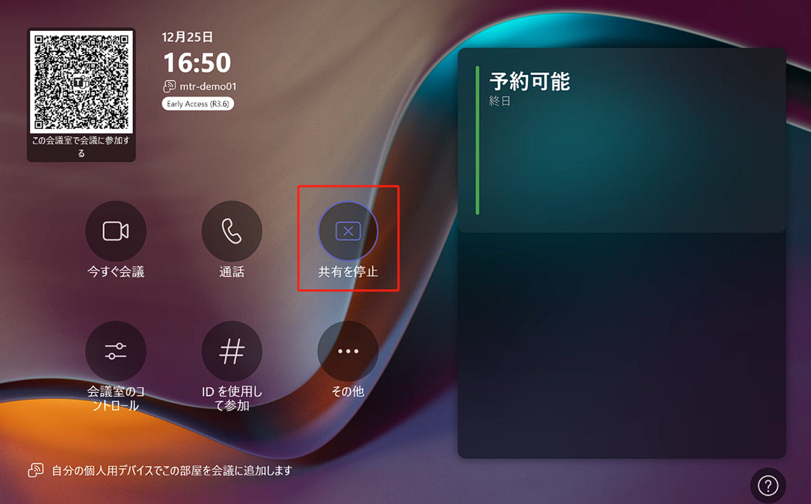 会議中でない場合に画面共有を行うと、会議室のディスプレイに映像が投影されます。