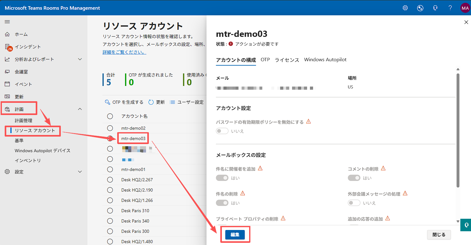計画 > リソースアカウント > [MTRデバイスにログインするアカウント] を選択します。