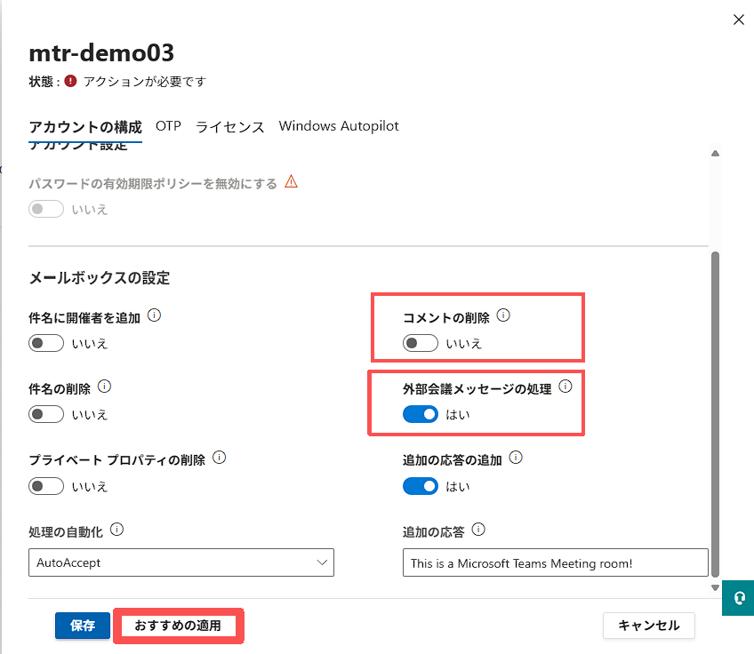 コメントの削除 [いいえ]、外部会議メッセージの処理 [はい] に設定して、保存を押してください。