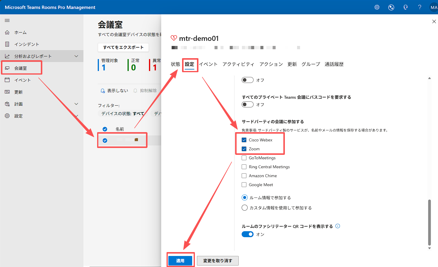 会議室 > デバイス選択 > [設定] タブ > [会議] タブ > サードパーティの会議に参加する > 使用したい会議をONにします。