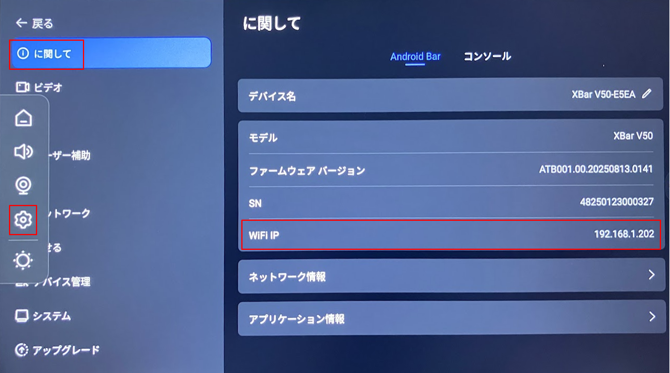 サイドバーから「設定」を開き、「About」を選択してください。Android Bar(XBar)のWi-Fi IP または LAN IP をご確認ください。